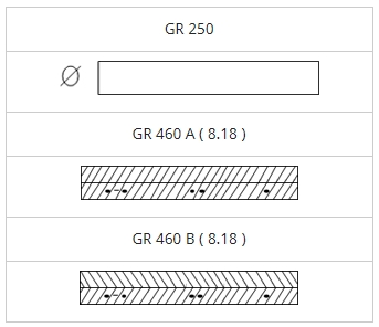 Element | GR 250 % max. | GR 460 A / B % max. | Ribs and Marking Method | ||